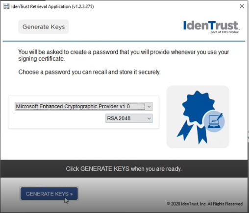 Keep the options selected above and click on "Generate Keys" to continue.